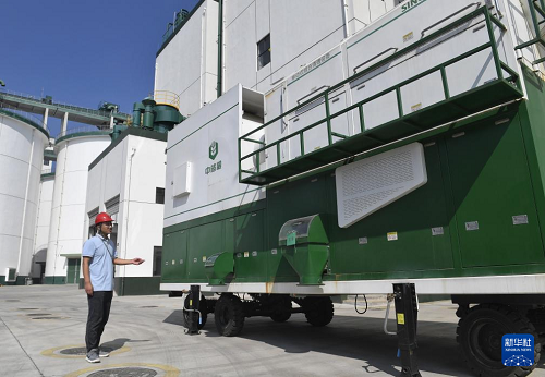 10月15日,在中儲(chǔ)糧成都青白江倉儲(chǔ)有限責(zé)任公司,技術(shù)人員介紹移動(dòng)式組合清理設(shè)備。(新華社記者 劉坤 攝)