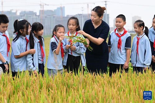 10月15日,江蘇省太倉市港城小學老師為孩子們講解水稻生長知識。(新華社發(fā) 計海新 攝)