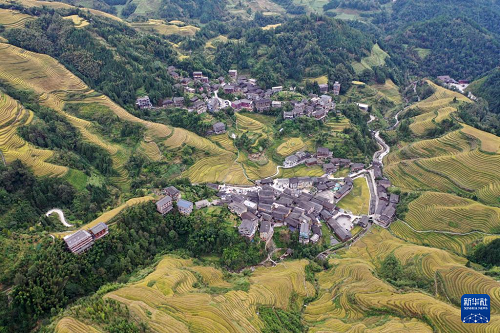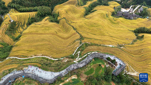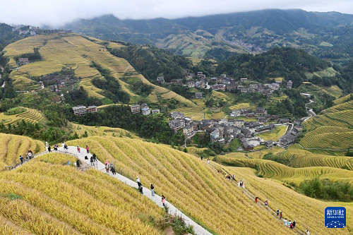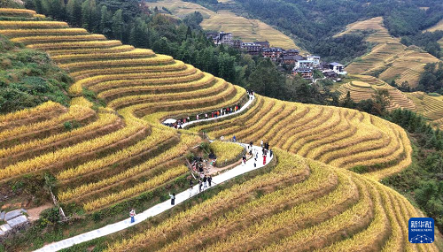 眼下,廣西龍勝各族自治縣龍脊梯田一片金黃,成為眾多游客觀光“打卡”的熱門景點(diǎn)。龍脊梯田已有2300多年歷史,是聯(lián)合國糧農(nóng)組織認(rèn)證的全球重要農(nóng)業(yè)文化遺產(chǎn)。