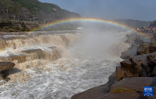 10月27日,游客在山西吉縣黃河壺口瀑布景區(qū)欣賞“彩虹橋”景觀。(新華社發(fā) 呂桂明 攝)