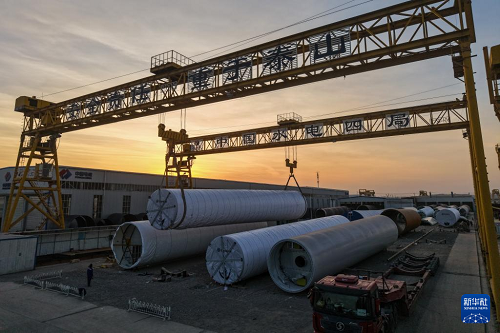 11月20日,在甘肅省酒泉經(jīng)濟(jì)技術(shù)開發(fā)區(qū)的中國(guó)水電四局(酒泉)新能源裝備有限公司裝運(yùn)生產(chǎn)線上,工作人員進(jìn)行風(fēng)機(jī)塔筒吊裝作業(yè)(無(wú)人機(jī)照片)。(新華社記者 郎兵兵 攝)