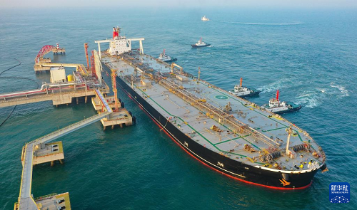 12月18日,一艘裝載著石化原輔料的外籍船舶泊入國(guó)投洋浦油儲(chǔ)碼頭30萬(wàn)噸級(jí)原油泊位(無(wú)人機(jī)照片)。(新華社記者 郭程 攝)