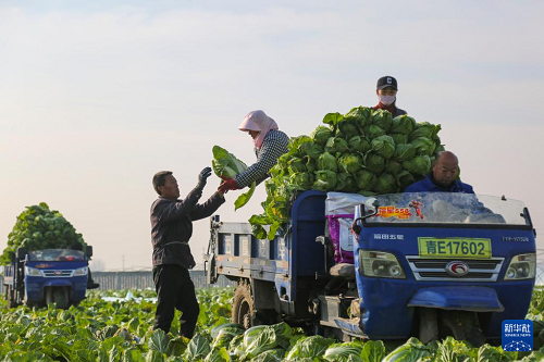 12月18日,農(nóng)民在山東省東營(yíng)市廣饒縣李鵲鎮(zhèn)將收獲的白菜裝車(chē)。(新華社發(fā) 劉云杰 攝)