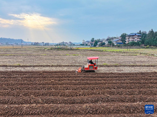 12月17日,湖南省常寧市洋泉鎮(zhèn)農(nóng)民駕駛農(nóng)機(jī)在翻耕農(nóng)田(無(wú)人機(jī)照片)。(新華社發(fā) 周秀魚(yú)春 攝)