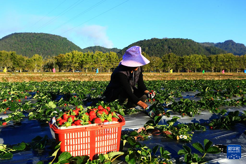 12月18日,云南省騰沖市和順鎮(zhèn)農(nóng)戶(hù)在采摘草莓。(新華社發(fā) 趙輝 攝)