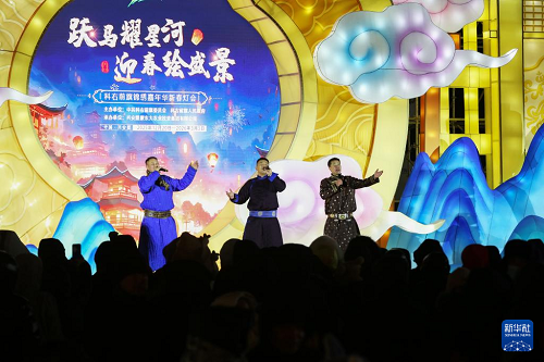 12月20日,當(dāng)?shù)貫跆m牧騎演員在燈會上表演。新華社發(fā)