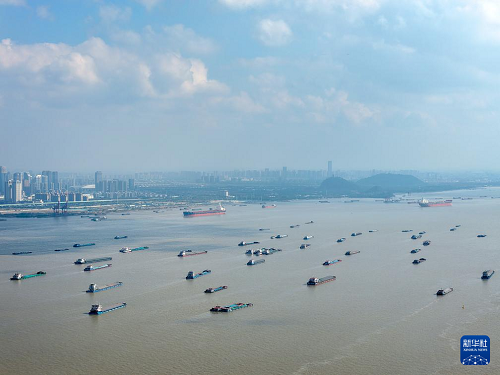 眾多貨船行駛在長江江蘇南通段江面上(11月5日攝,無人機照片)。(新華社發(fā) 許叢軍 攝)