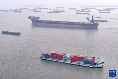 12月29日,集裝箱船在長江江蘇南通段行駛(無人機照片)。(新華社發(fā) 許叢軍 攝)
