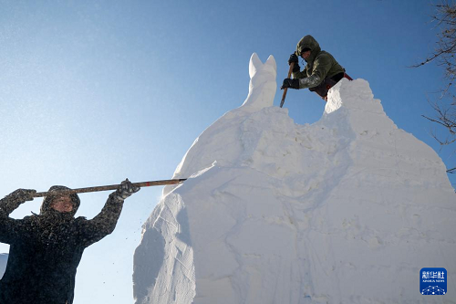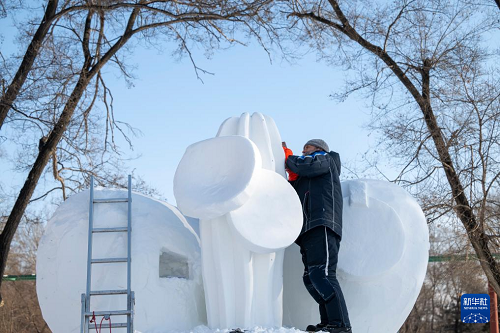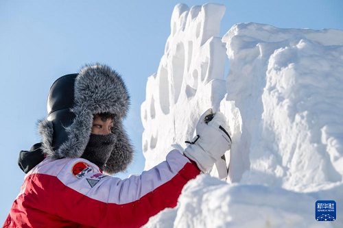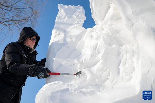 1月7日,在哈爾濱太陽(yáng)島雪博會(huì)園區(qū),來(lái)自13個(gè)國(guó)家的25支代表隊(duì)百余位藝術(shù)家在寒冬中堅(jiān)持藝術(shù)創(chuàng)作,精雕細(xì)琢雪雕作品。