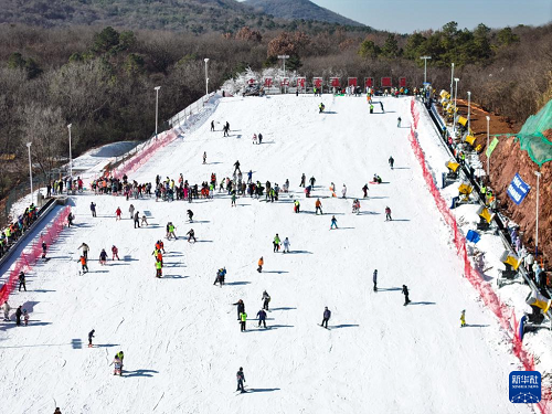 1月11日,游客在江蘇省句容市寶華山滑雪場滑雪(無人機照片)。(新華社記者 季春鵬 攝)