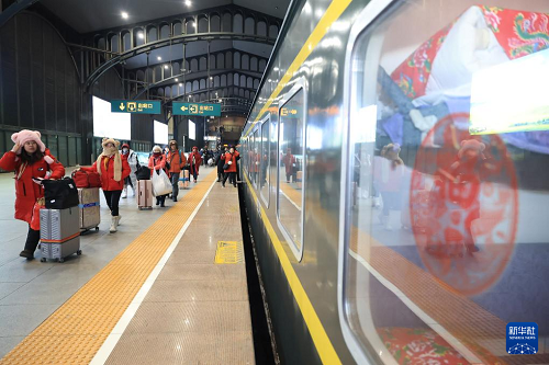 1月19日,國際旅游團的外籍游客在哈爾濱站登乘K7041次“東北民俗”主題列車。(新華社發(fā) 徐率 攝)