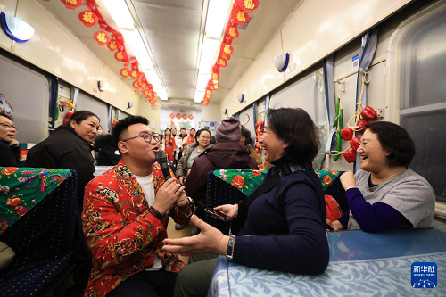 1月19日,來自馬來西亞的游客(右二)在K7041次“東北民俗”主題列車上與主持人互動。(新華社發(fā) 徐率 攝)