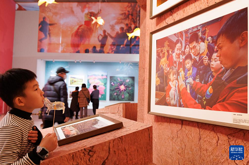1月26日,在中國非物質(zhì)文化遺產(chǎn)館舉行的展覽現(xiàn)場,小朋友被一幅攝影作品吸引。(新華社記者 金立旺 攝)