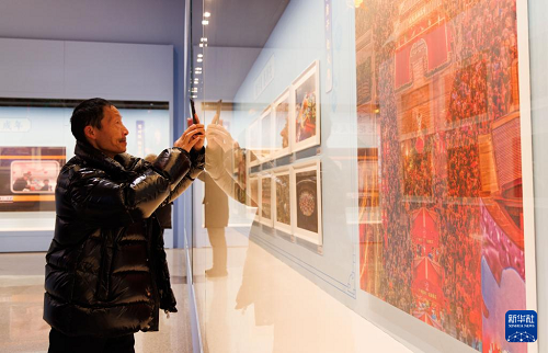 1月26日,在中國非物質(zhì)文化遺產(chǎn)館舉行的展覽現(xiàn)場,觀眾用手機(jī)拍攝展覽作品。(新華社記者 金立旺 攝)