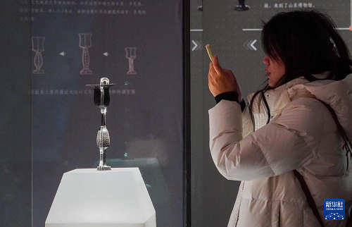 1月27日,觀眾在山東博物館參觀“對話蛋殼黑陶高柄杯”明星文物展。(新華社記者 徐速繪 攝)