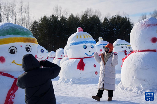 1月29日,游客在漠河北極村景區(qū)內(nèi)的北極沙洲與雪人“矩陣”合影。(新華社記者 王祚 攝)