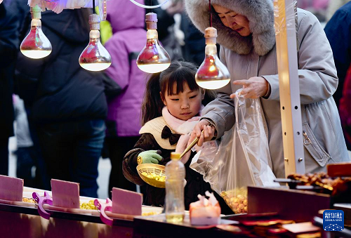 2月3日,游客在寧夏固原市西吉縣年貨大集上選購美食。(新華社記者 楊植森 攝)