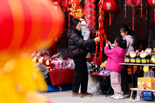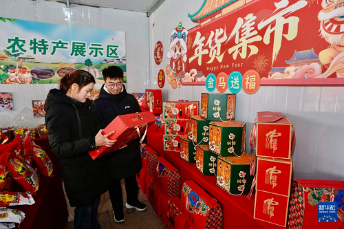 2月3日,游客在寧夏固原市西吉縣年貨大集上選購年貨產(chǎn)品。(新華社記者 楊植森 攝)