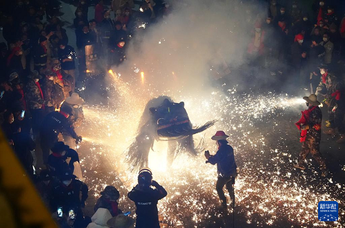“蜀河燒獅子”于每年農(nóng)歷正月十三至十六舉行。夜幕降臨后,舞獅隊(duì)伍會(huì)走街串巷,在家家戶戶門前停留,通過舞獅來傳遞祝福。在此過程中,表演人員和圍觀群眾會(huì)點(diǎn)燃特制的煙花,朝“獅子”噴射火花。根據(jù)當(dāng)?shù)亓?xí)俗,“燒獅子”象征迎來好運(yùn)與吉祥,火花越猛,新年的運(yùn)勢(shì)越興旺。