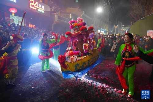 3月2日,在陜西旬陽(yáng)市蜀河鎮(zhèn)蜀河社區(qū),表演人員在“燒獅子”間歇時(shí)表演劃彩蓮船。(新華社記者 邵瑞 攝)