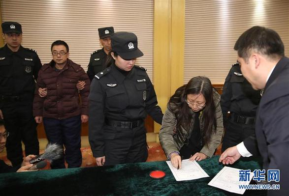 2月6日,在北京首都機(jī)場,檢察官向“百名紅通”嫌犯付耀波(右五)、張清曌(右二)宣讀相關(guān)法律文書。當(dāng)日,在中央追逃辦統(tǒng)一部署下,在外交部、公安部及我駐巴巴多斯、格林納達(dá)等駐外使館的大力協(xié)助下,遼寧省追逃辦組織協(xié)調(diào)檢察、公安等部門,成功將遠(yuǎn)逃至加勒比海島國圣文森特和格林納丁斯的“百名紅通”第39號嫌犯付耀波、第41號嫌犯張清曌同時(shí)抓獲歸案。新華社記者殷剛攝