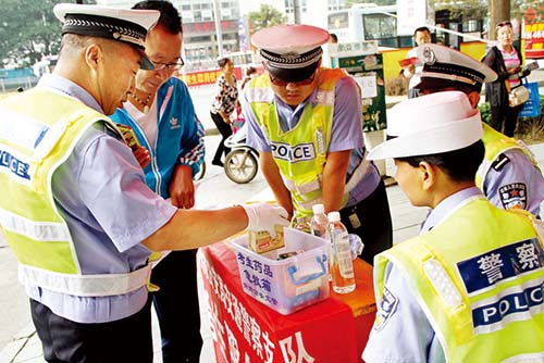 考試期間,市公安局交警支隊在各考點(diǎn)設(shè)置了便民服務(wù)點(diǎn),備好遮陽傘、雨傘、保溫水桶、礦泉水和考試專用的鋼筆、橡皮。便民服務(wù)臺還放置一個小藥箱,里面?zhèn)溆星鍥鲇?、防暑藥、藿香正氣水、感冒藥、腹瀉藥、速效救心丸、降壓藥等應(yīng)急藥品,以防考生及家長急用。