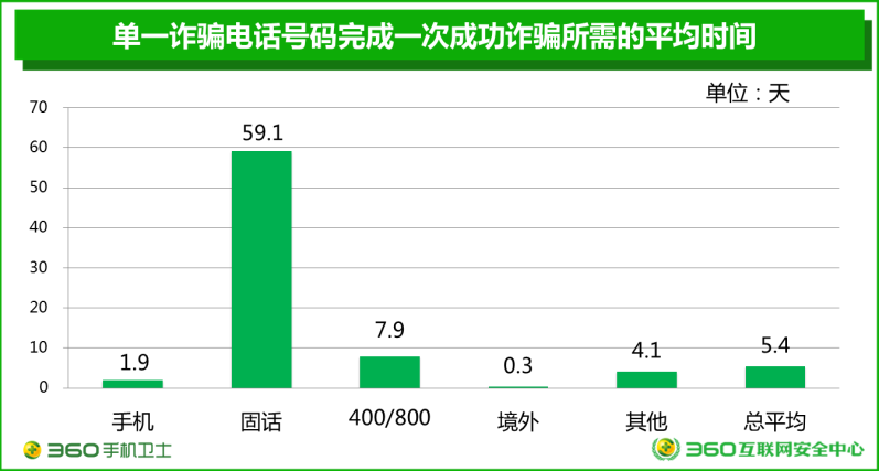 其中,效率最高的是境外呼入的詐騙電話,一個號碼約平均每7個小時(0.3天)就能成功詐騙一次,但其代價是巨大的撥打量;其次是手機號碼,一個號碼約平均每兩天(1.9天)就能成功詐騙一次;400/800號碼約每周多一點時間(7.9天)可成功詐騙一次。