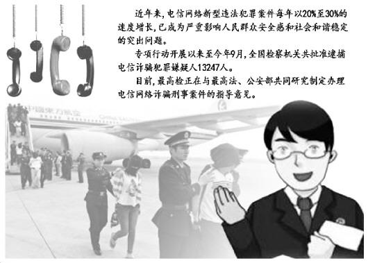 《法制日?qǐng)?bào)》記者從最高人民檢察院與公安部近日聯(lián)合召開的電信網(wǎng)絡(luò)新型違法犯罪重點(diǎn)整治、突出地區(qū)督導(dǎo)會(huì)上了解到,被掛牌的7個(gè)重點(diǎn)地區(qū)和5個(gè)突出地區(qū)檢察機(jī)關(guān)積極主動(dòng)作為,出重拳、下重手、用重典,快速批捕起訴了一批有震動(dòng)、有影響的重大電信網(wǎng)絡(luò)詐騙犯罪案件,取得了初步成效。據(jù)統(tǒng)計(jì),專項(xiàng)行動(dòng)開展以來至今年9月,全國(guó)檢察機(jī)關(guān)共批準(zhǔn)逮捕電信詐騙犯罪嫌疑人13247人。