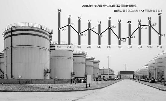 數(shù)據(jù)顯示,2016年1~11月天然氣進(jìn)口量4798萬噸,同比增長21.6%,天然氣進(jìn)口量占產(chǎn)量與進(jìn)口量之和的比重已達(dá)到34.9%,比去年同期提高了3.8個(gè)百分點(diǎn)。