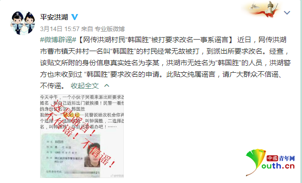 3月14日下午,湖北省洪湖市公安局官方微博@平安洪湖 發(fā)布微博辟謠稱,網傳洪湖村民"韓國勝"被打要求改名一事系謠言。