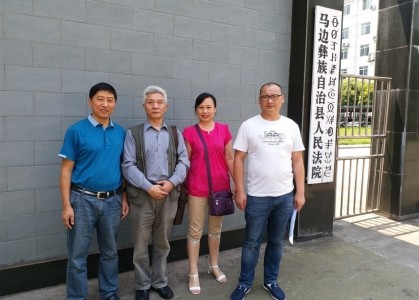 5月27日宣判無罪后,朱晉川(右一)和母親、律師在法院外留影。