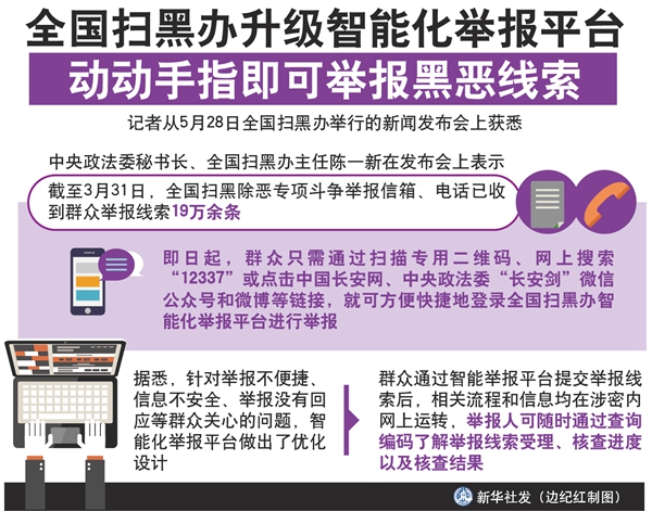 新華社北京5月28日電(記者白陽)還在擔(dān)心舉報(bào)黑惡線索不便捷、不安全、沒回應(yīng)?即日起,群眾只需通過掃描專用二維碼、網(wǎng)上搜索“12337”或點(diǎn)擊中國長(zhǎng)安網(wǎng)、中央政法委“長(zhǎng)安劍”微信公眾號(hào)和微博等鏈接,就可方便快捷地登錄全國掃黑辦智能化舉報(bào)平臺(tái)進(jìn)行舉報(bào)。