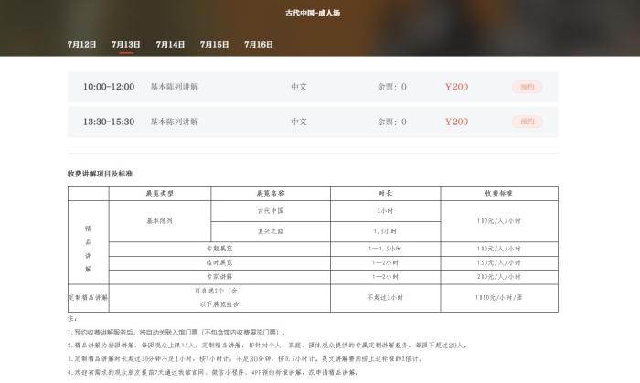古代中國展收費講解項目及標準 截圖自國家博物館官網