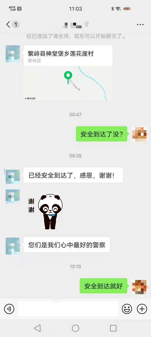 接到報警后,神堂堡派出所民警迅速通過電話聯(lián)系報警人,得知車上共有七人,多為婦女兒童,民警首先安撫游客情緒,并在確定具體地點后,立即與神堂堡交警中隊民警驅(qū)車趕往事發(fā)地。到達現(xiàn)場后,民警了解到,報警人張某與家人朋友自駕前往五臺山旅游,開到蓮花崖大峽谷山區(qū)路段時由于路面有冰導(dǎo)致車輛打滑沖出路面,車輛正被困在一處斜坡處,距離前面的深溝只有一米左右,進退兩難,無法動彈。此時,車上幾名游客已凍得瑟瑟發(fā)抖,情況不容樂觀。民警們第一時間制定救援措施,他們不畏嚴寒、相互配合,經(jīng)過長時間的努力,終于將被困車輛從冰面推到了無冰路段。車輛脫困,游客對民警們的及時救援表示了由衷的感謝,緊緊握住民警的手,激動地說:“非常感謝警察同志的幫助,您們是我們心中最好的警察!”
