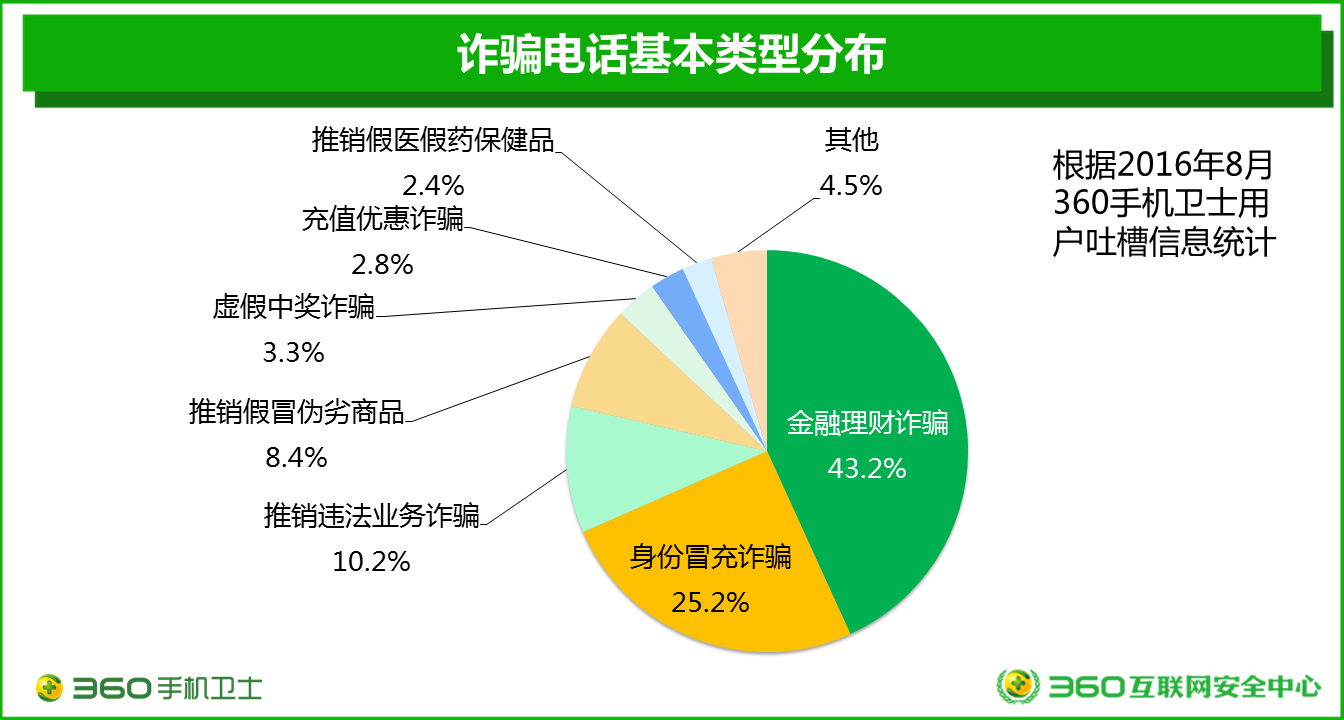 9月7日,360在京發(fā)布了國(guó)內(nèi)首份基于大數(shù)據(jù)研究的電信詐騙分析報(bào)告——《2016中國(guó)電信詐騙形勢(shì)分析報(bào)告》。報(bào)告中顯示,在用戶(hù)接到的所有詐騙電話中,虛假的金融理財(cái)詐騙最多,占43.2%,此類(lèi)詐騙在北上廣深等大城市尤其盛行。其次是身份冒充詐騙,占25.2%。各類(lèi)虛假的業(yè)務(wù)推銷(xiāo)電話也是被用戶(hù)大量吐槽的詐騙電話類(lèi)型。