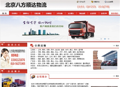 由于時(shí)間緊急,平常聯(lián)絡(luò)的物流公司暫時(shí)沒車,配送不了。當(dāng)天,該公司的行政人員從網(wǎng)絡(luò)上搜索武漢到北京的物流專線,發(fā)現(xiàn)一家名為“八方順達(dá)物流”的公司,紅色主頁的網(wǎng)站上,顯示有客服電話、物流、接單、登記、調(diào)用安排、在途追蹤等具體信息。