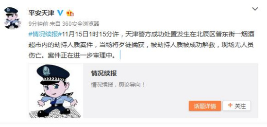 中新網11月15日電 據天津市公安局官方微博通報,11月15日1時15分許,天津警方成功處置發(fā)生在北辰區(qū)普東街一煙酒超市內的劫持人質案件,當場將歹徒擒獲,被劫持人質被成功解救,現場無人員傷亡。