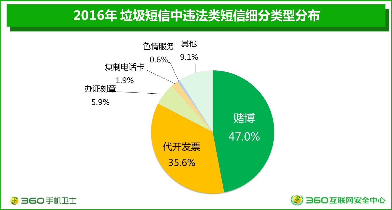 而在違法類垃圾短信中,賭博類短信的占比最高,為47.0%,其次為代開發(fā)票類垃圾短信35.6%、辦證刻章(5.9%)、復(fù)制電話卡(1.9%)、色情信息(0.6%)。相較于往年,代開發(fā)票的短信有所減少,但賭博類依然保持“第一陣營”。