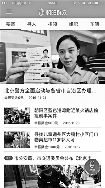 但北青報(bào)記者注意到,APP頁(yè)面上的新聞并非最新信息,均為2016年下半年消息,已有數(shù)月未更新。此舉也引發(fā)部分網(wǎng)友質(zhì)疑:“朝陽(yáng)群眾HD”是否由警方開發(fā)?注冊(cè)手機(jī)號(hào)后進(jìn)行“舉報(bào)”是否存安全隱患?