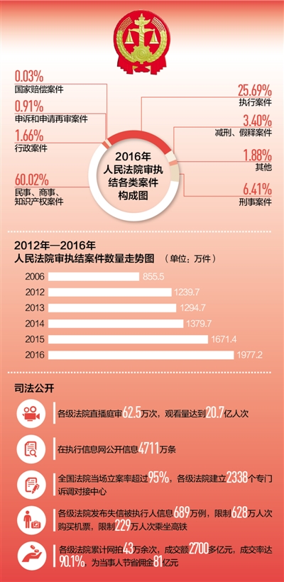 2016年,各級法院向執(zhí)行難全面宣戰(zhàn),共受理執(zhí)行案件614.9萬件,執(zhí)結(jié)507.9萬件,同比分別上升31.6%和33.1%,執(zhí)行到位金額1.5萬億元,同比上升54%。與公安部等10多個部門建立網(wǎng)絡(luò)執(zhí)行查控系統(tǒng),執(zhí)行法官足不出戶即可依法查詢被執(zhí)行人財產(chǎn)和相關(guān)信息,實(shí)現(xiàn)了執(zhí)行模式的根本變革。發(fā)布失信被執(zhí)行人信息689萬例,限制628萬人次購買機(jī)票,限制229萬人次乘坐高鐵。依法懲治拒不執(zhí)行裁判行為,司法拘留1.6萬人,追究刑事責(zé)任2167人,讓司法裁判真正成為懲治違法失信的利劍。