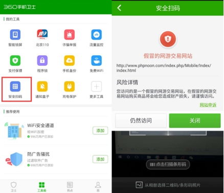 第五,使用360手機(jī)衛(wèi)士等安全管理軟件,通過(guò)安全掃碼功能掃描二維碼,識(shí)別釣魚(yú)網(wǎng)站以及手機(jī)木馬,保護(hù)手機(jī)安全不中招。