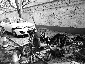 昨日,北京晨報(bào)記者來到酒仙橋二街坊附近,在1號(hào)樓樓下聚著一群人,正在討論凌晨爆炸的事情,“簡(jiǎn)直就是個(gè)移動(dòng)隱患”,“還好不是白天,不然肯定有人受傷”。記者看到,一輛綠色三輪車嚴(yán)重?fù)p毀,車輪扭曲倒在地上,車身部分被炸成了一張橫鋪著的大鐵皮,經(jīng)過灼燒后變得焦黑。三輪車的部分零件丟失,旁邊的樹上掛著鐵條,十幾米外的墻邊散落著三輪車的架子,而車輛原本放置電瓶的地方空無一物。在三輪車旁,一個(gè)大煤氣罐被炸成三部分,中間圓筒狀變成一塊鋪展后約1平方米的厚鐵皮,上下兩端則變成兩個(gè)圓形的蓋子(如圖)。