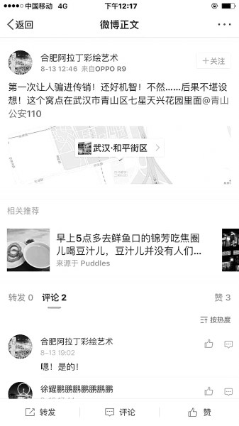 上車后,在確認自己已經(jīng)安全的情況下,小王拿出手機,在微博上@青山公安110舉報了該傳銷窩點,并提供了青山區(qū)和平大道附近該小區(qū)的定位。