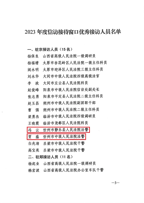 近日,山西省高級人民法院下發(fā)《關(guān)于對2023年度信訪接待窗口優(yōu)秀接訪人員予以表揚(yáng)的通報》,忻州法院2名干警榜上有名。忻州中院黨組書記、院長栗向東作出批示,要求全市法院干警以受到表揚(yáng)的同志為榜樣,愛崗敬業(yè),爭當(dāng)先進(jìn),爭創(chuàng)一流工作業(yè)績。