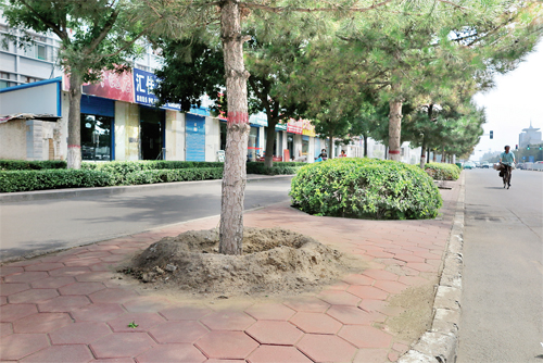 近日,記者途經(jīng)城區(qū)長征西街建設(shè)路口時(shí),發(fā)現(xiàn)在道路北側(cè)的綠化帶內(nèi),有的行道樹樹坑只是用土堆進(jìn)行了簡單的堆砌,時(shí)值秋雨多發(fā)時(shí)期,在雨天極易造成一定程度的水土流失。希望市政管理部門能夠引起重視,早日為樹坑穿上一件“金鐘罩”。(王君 攝)