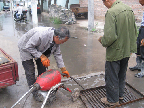 汛期以來,河曲縣南園村立足于防大汛、抗大災(zāi),積極組織人員排查整治安全隱患。降雨后,個(gè)別下水道露出淤塞“真容”,村里立即請(qǐng)來管道疏通師傅,并派村民配合,發(fā)現(xiàn)一處,疏通一處,預(yù)防水災(zāi)。圖為管道疏通師傅和村民一起疏通村西頭道路下水口。(賈金理 攝)