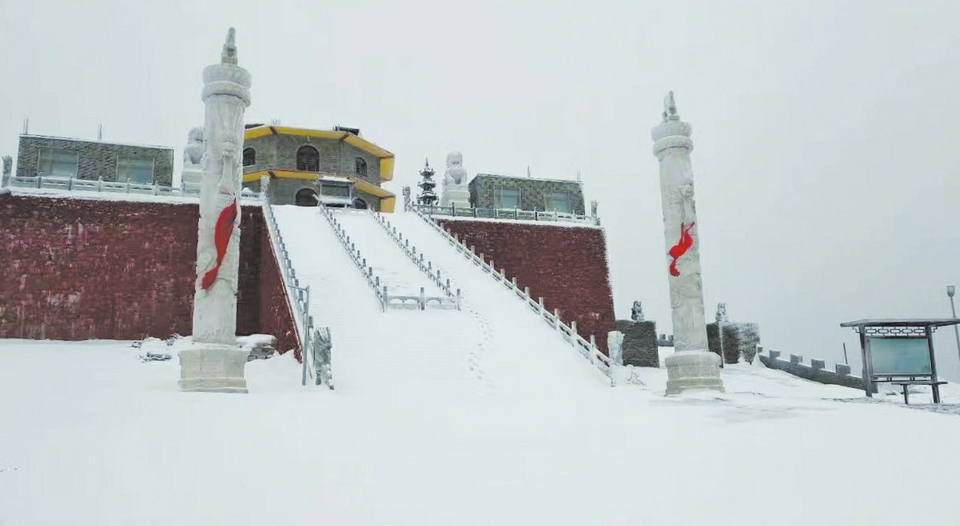 此次降雪主要分布在五臺(tái)山平均海拔2800米以上的五座臺(tái)頂。因?yàn)榕_(tái)頂與臺(tái)懷腹地海拔相差1000米以上,所以時(shí)有“臺(tái)懷飄雨臺(tái)頂雪”的奇觀出現(xiàn)。東臺(tái)頂亦名望海峰,《清涼山志》載:“蒸云寢壑,爽氣澄秋,東望明霞,若陂若境,即大海也。亦見滄瀛諸州,因以為名?!蓖7迨俏迮_(tái)山觀日出的絕佳位置。7日一大早,東方不見明霞,整個(gè)東臺(tái)頂銀裝素裹,霧靄茫茫,天籟梵音依舊,在圣潔的佛國仙境踏雪而行,更深切地感受人生一步一個(gè)腳印的意義。(本報(bào)記者 馬卓超 通訊員 覺一 攝影報(bào)道)
