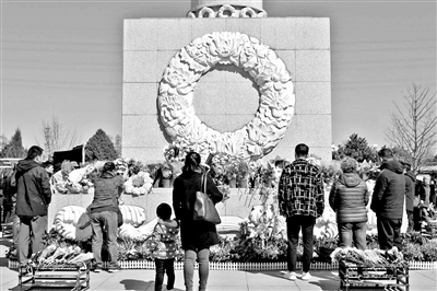 家屬手捧鮮花,在北京長青生命紀(jì)念園生態(tài)葬紀(jì)念碑前祭奠逝者 攝影/本報記者 魏彤