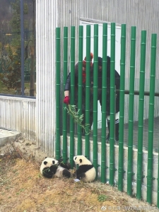 “雙方努力下順利會(huì)師,成功偷摸到熊貓貓啦!”4月7日中午12點(diǎn)47分,小韓發(fā)布了這條微博,附了9張配圖。在這些圖片中可以看到,三只幼年大熊貓?jiān)谝欢尉G色柵欄下打滾嬉戲、往上攀爬。而最后3張圖片里可以看到,有至少2只不同的手與幼年大熊貓直接接觸,疑似一名男性、一名女性,其中一只手涂了鮮艷指甲油,正觸摸幼年大熊貓頭頂。