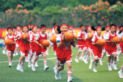 學(xué)生在運(yùn)動(dòng)會(huì)上展示集體籃球操